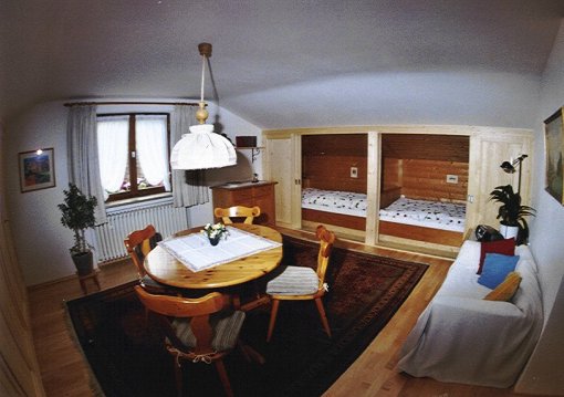 | Diese Wohnung liegt ebenfalls im Dachgeschoss, misst ca. 62 qm, bietet bis zu 6 Personen Platz und einen herrlichen Blick auf Kloster und Estergebirge | ![]() |
