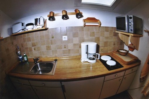 Die Küche ist mit vielerlei Elektrogeräten (Microwelle etc.) und Geschirr ausgestattet.